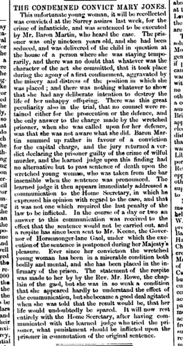 Mary Jones, aged just 19, was arrested on 11 September 1858, charged with the wilful murder of a newborn female child at Hambledon, Surrey on 30 August 1858. Her trial took place at the Kingston-upon-Thames Assizes on 29 March 1859. She was found guilty and sentenced to death.